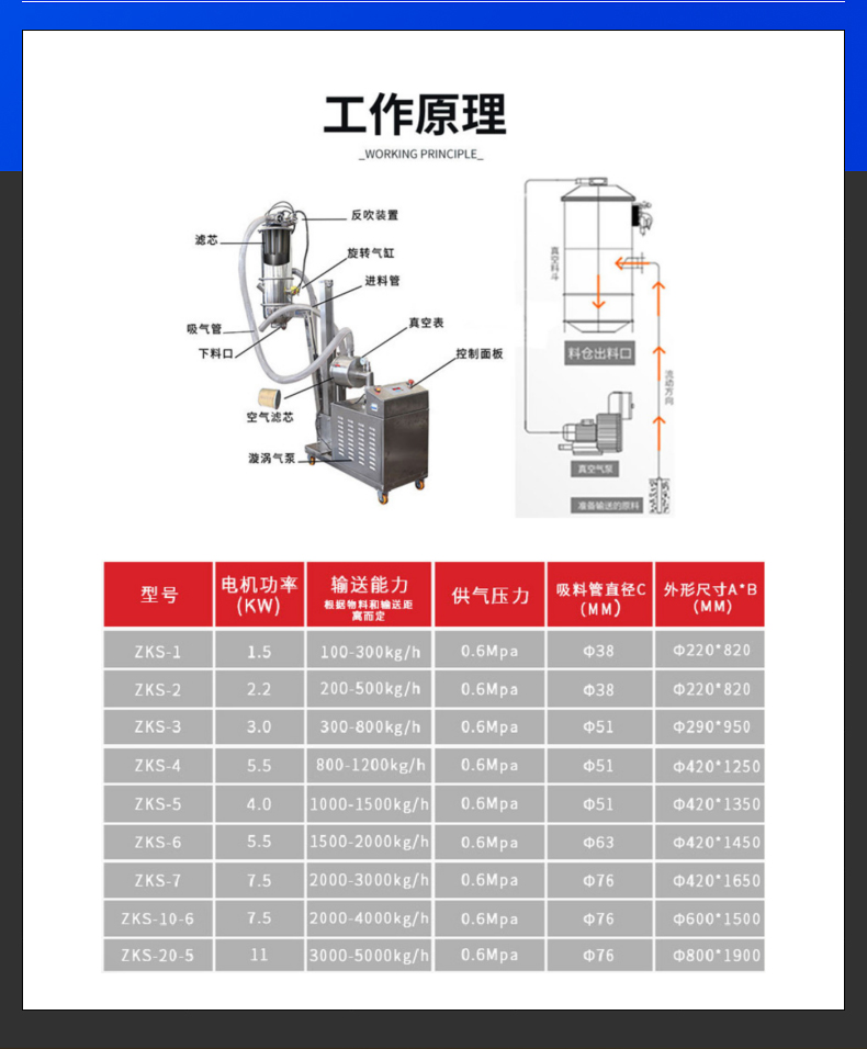ZKS系列真空上料機(jī)是用漩渦氣泵抽氣,使吸嘴進(jìn)口處及整個(gè)系統(tǒng)處于一定的負(fù)壓狀態(tài),粉粒料隨同外界空氣被吸入料嘴,形成料氣流,經(jīng)過(guò)吸料管到達(dá)料斗,在料斗中進(jìn)行氣、料分離。分離后的物料進(jìn)入受料設(shè)備。送料--放料是通過(guò)氣動(dòng)換向閥不斷地開(kāi)、閉來(lái)完成的,而氣動(dòng)換向閥的開(kāi)閉是由控制中心來(lái)控制的。